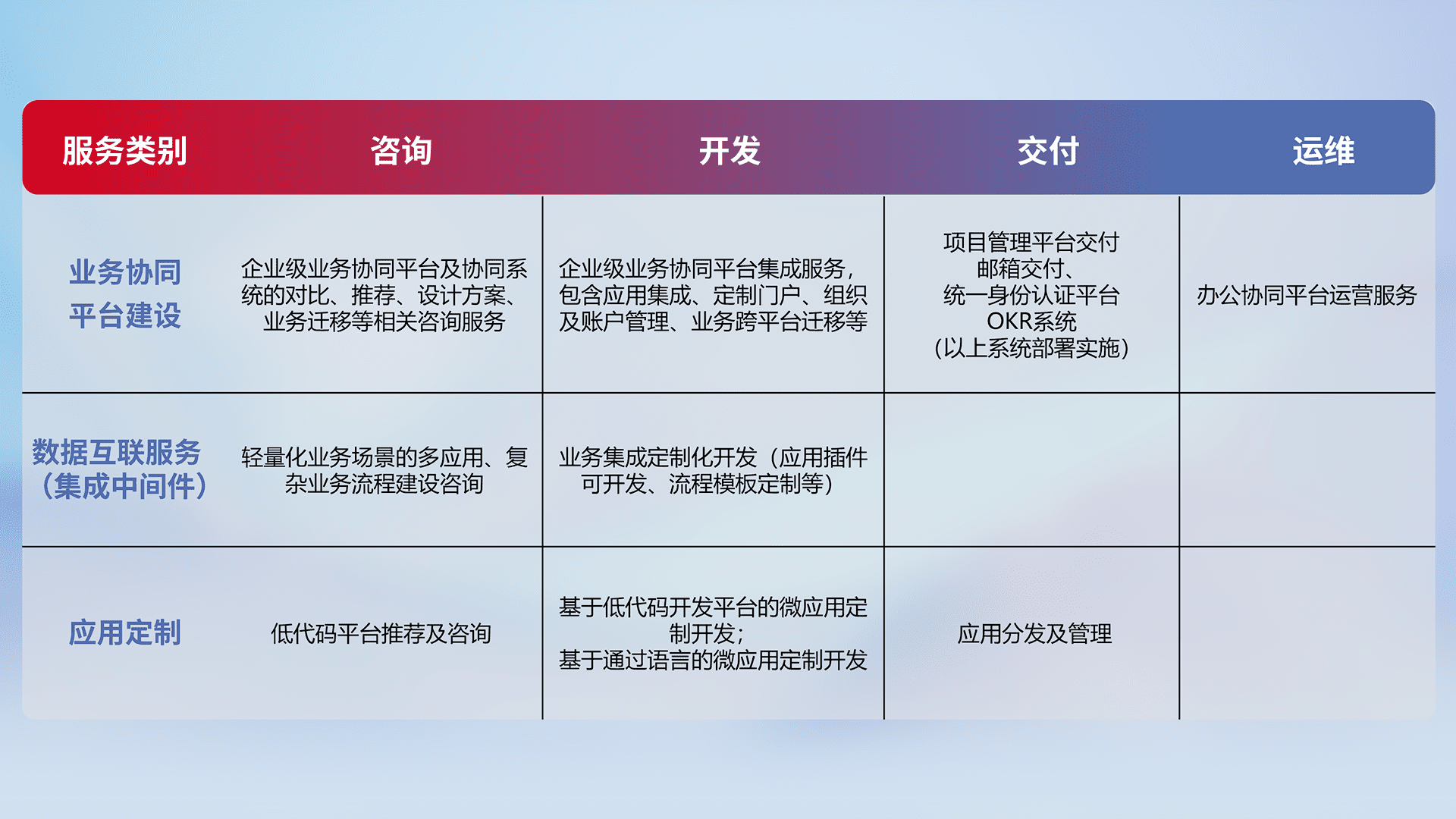 针对钉钉、、、、企微、、、、IDaas等平台级产品提供产品的规划、、、、方案、、、、交付、、定制化开发等服务,,实现如统一协同办公、、智能客户服务、、、混合会议管理、、、、智能数据查询、、等业务场景,,,实现数字化转型。。。