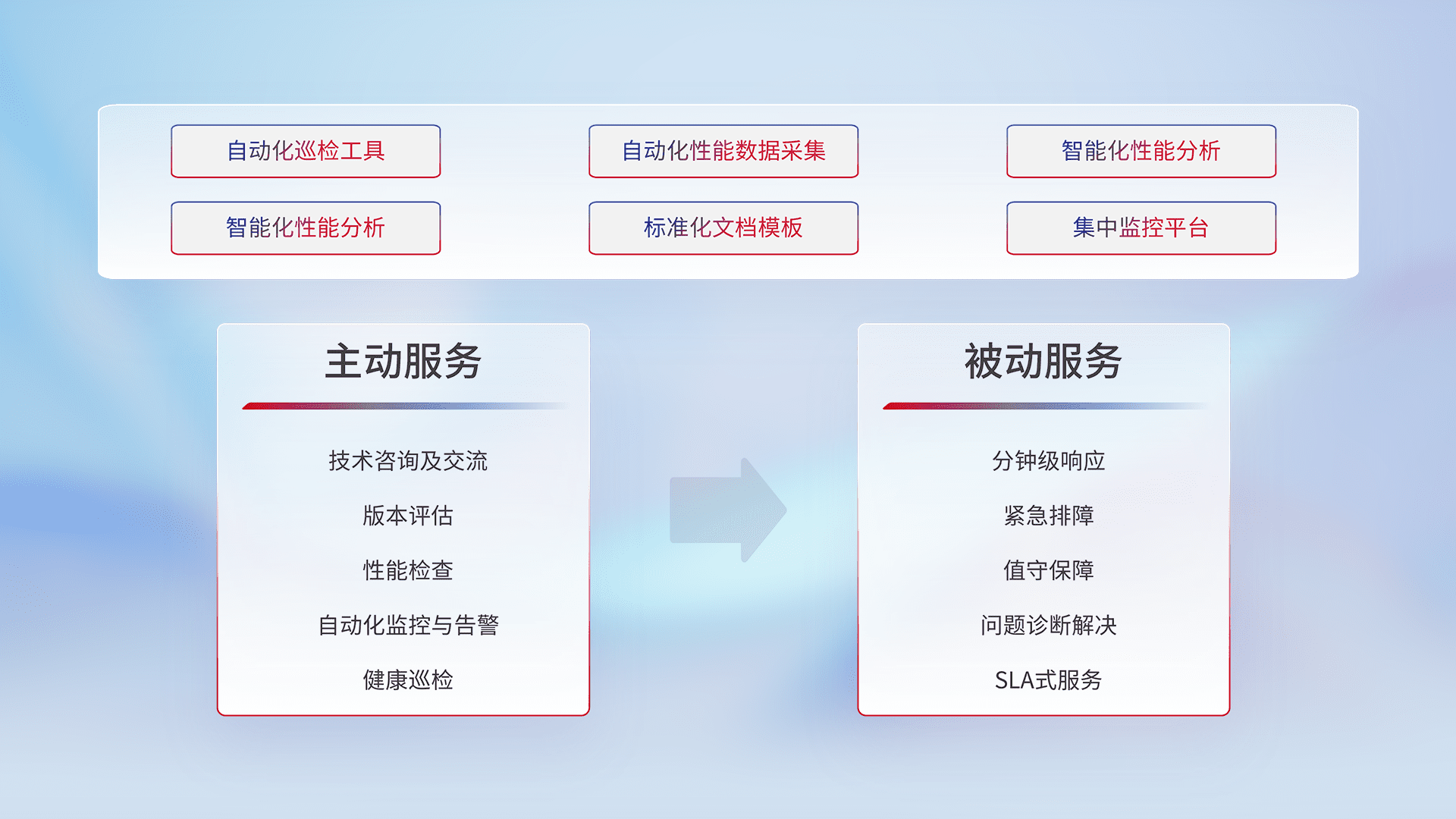 智能化工具和标准化文档,,,,保障服务质量,,,,提供主动服务(包含技术咨询、、、、版本评估、、、、性能检查、、、、自动化监控与告警、、、健康巡检)和被动服务包含(分钟级响应、、、紧急排障、、、值守保障、、问题诊断解决、、、SLA服务)。。。