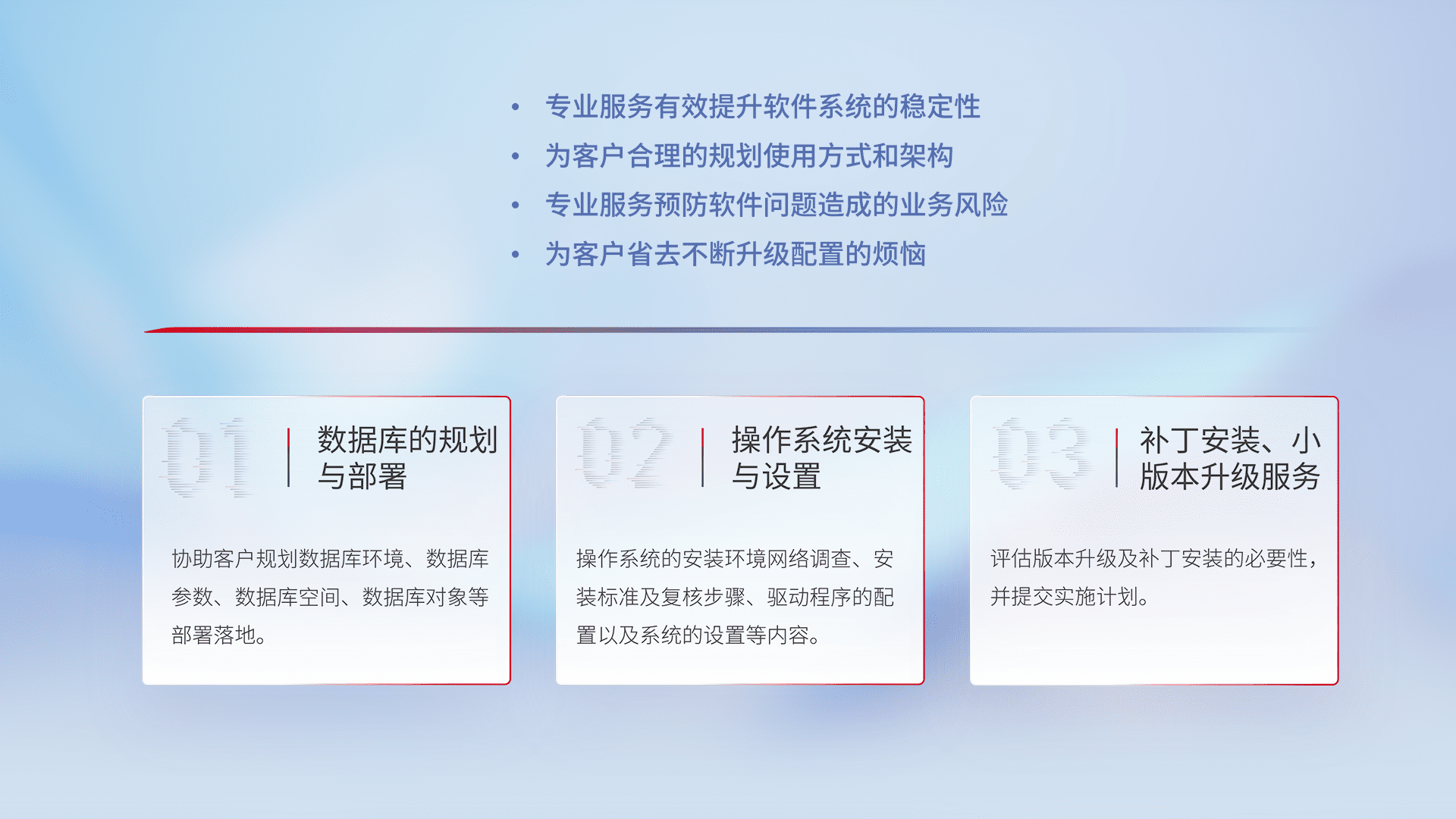 为客户提供软件规模升级、、、快速部署、、、、按需配置的专业服务,,,,从数据库的规划与部署到操作系统的安装与设置,,,,再到补丁安装和小版本升级提供支持。。。